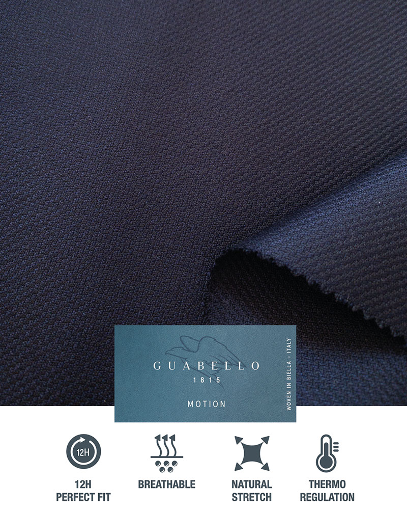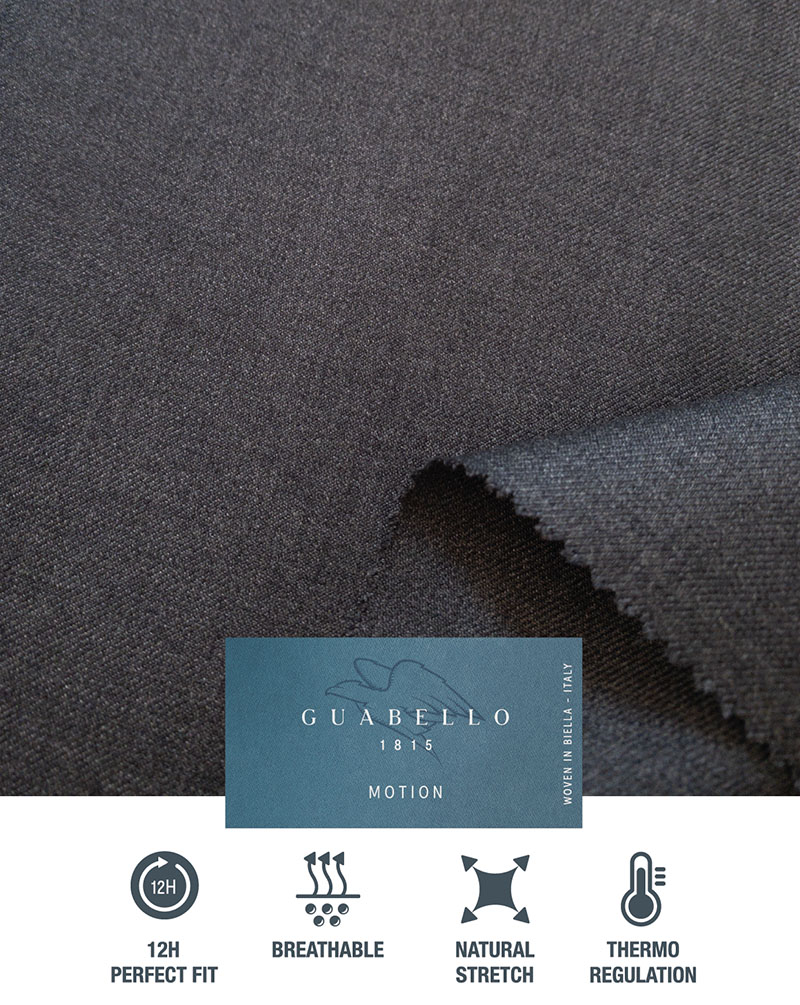 Motion is an innovative fabric, the result of an advanced technology that guarantees a high level of natural stretch, with no use of synthetic nor artificial yarns. Crafted to meet the demands of a contemporary and dynamic customer, who seeks maximum comfort but doesn’t want to give up elegance.